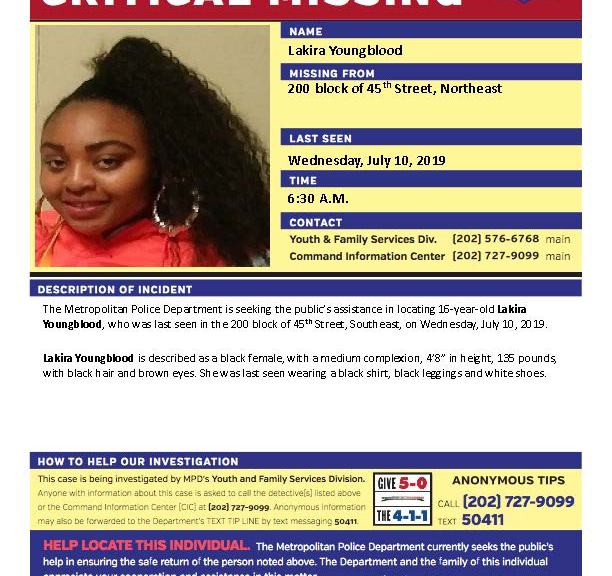 Police are searching for a missing teenage girl in DC. Sixteen-year-old Lakira Youngblood was last seen on Wednesday in the 200-block of 45th Street in Southeast. She is described as a black female who is four-foot-eight and weighs 138 pounds. Youngblood was last seen wearing a black shirt, black leggings and white shoes. Anyone with information on her whereabouts should contact police right away at 202-727-9099 or text 50411.